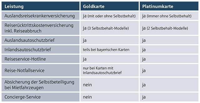Generell sind die Platinumkarten mit umfangreicheren Leistungen ausgestattet. Es gibt nicht nur umfassendere Versicherungs- und Serviceleistungen; auch inhaltlich sind die einzelnen Leistungskomponenten teilweise höherwertig: Bei der Reiserücktrittkostenversicherung beträgt die Versicherungssumme für Goldkarteninhaber z. B. maximal 10.000 EUR (abzüglich Selbstbeteiligung). Bei den Platinumkarten sind hingegen Reisen bis zu 15.000 EUR abgesichert.